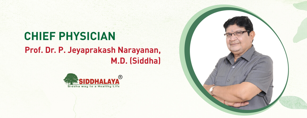 Prof. Dr. P. Jeyaprakash Narayanan M.D. (Siddha) is a 6th Generation Siddha Physician was born in Puliyangudi, Tirunelveli district in the year 1949. He hails from a family of renowned physicians, practicing the ancient medical science for over 400 years, starting from Valangai Puli Pandithar, who lived near Coutrallam, TamilNadu. He has clinical experience that spans over 40 years and has also played a stellar role in the field of Siddha education, literary research, evaluation of metallic preparations, formulating drugs to combat viral infections like HIV, Hepatitis B and C. He is also a member in numerous scientific committees, at the level of the State and Central Government and other private research organisations. Along with being the Chief Physician at Siddhalaya, Prof. Dr. P. Jeyaprakash Narayanan is also the Managing Director of Jeya Indian Medicine Pharmaceutical Private Ltd., which manufactures speciality Siddha medicines of the highest quality. He is passionately involved in the noble task of taking the Siddha system of medicine to the world and to achieve this mission he plays a key role in organising various conference and workshops at the national and international level.